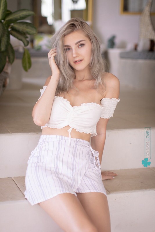 Плавно двигаясь перед камерой всем телом и постепенно избавившись от одежды, красивая нежная блондинка оголила свои большие упругие сиськи и, рассевшись на ступеньках в максимально доступных позах, бесстыже засвечивает между ног свою бритую маленькую киску.