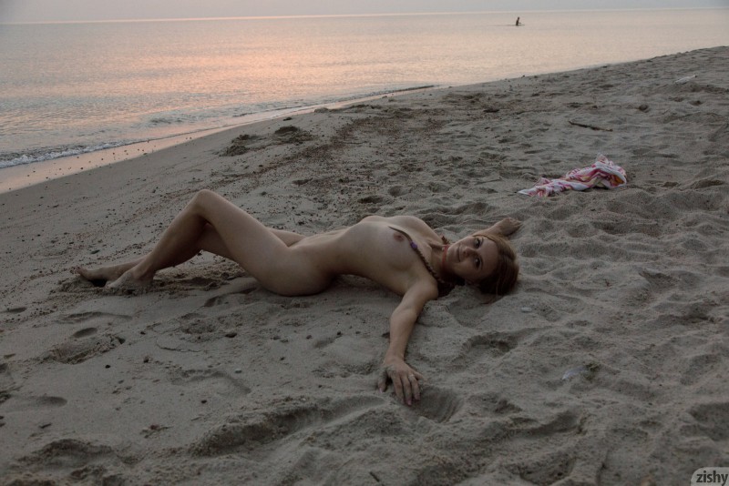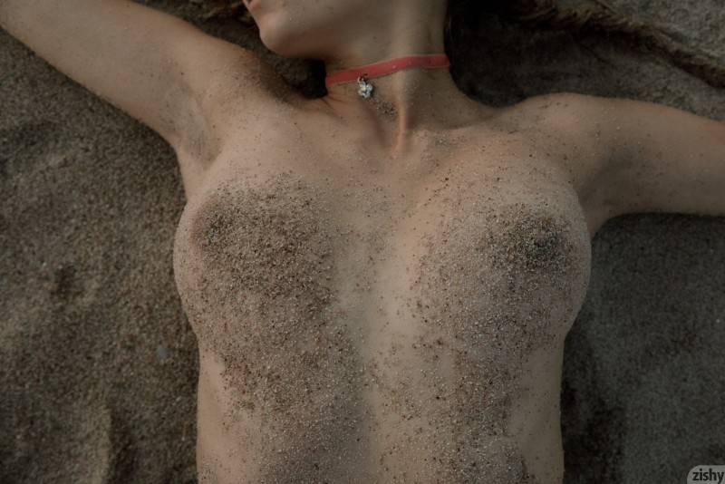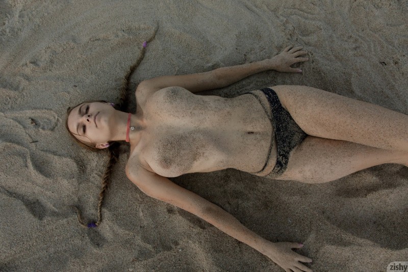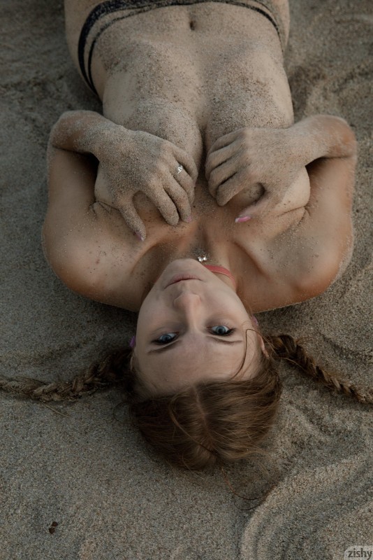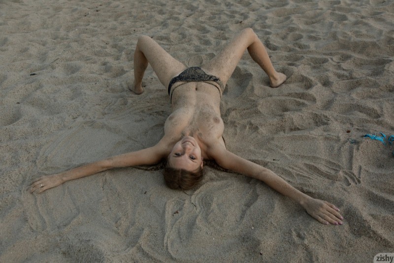 Очаровательная русская девушка сняла купальник на пляже и нашему взору открылась её потрясающая упругая грудь и красивая голая попка с пышными ягодицами. Красавица вся измазалась в песке, от чего стала выглядеть ещё более соблазнительной. Она без лишней скромности показывает свою бритую киску и принимает для этого самые возбуждающие позы.