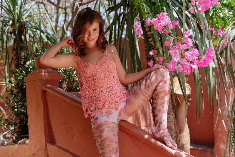 Раскрепощённая и практически голая девушка снимает цветные колготки под которыми нет трусов. Обнажившись она сразу же позволяет нам взглянуть на свою бритую письку и аппетитную задницу с пышными ягодицами. Но яркими фото получились не только благодаря колготкам, а ещё и прелестным цветам на фоне которых милашка позирует.
