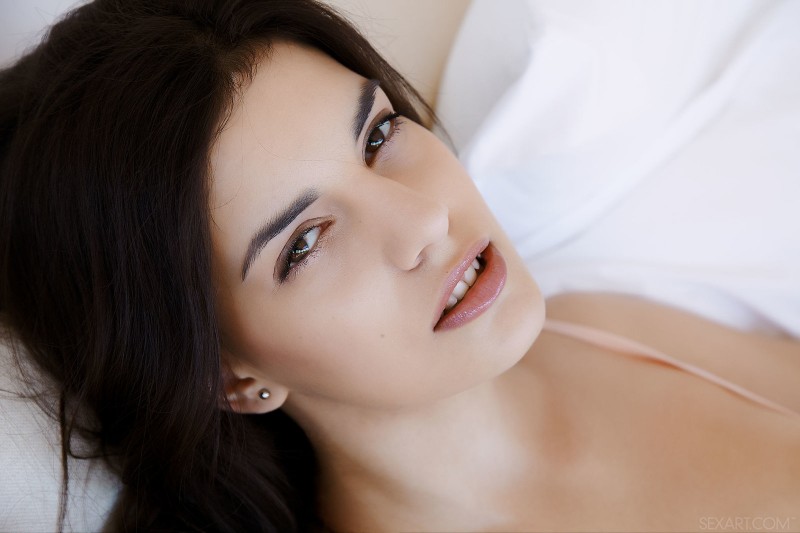 Сексуальная брюнетка с возбуждающей голой киской лежит в постели и красуется перед фотокамерой. В откровенных позах она позволяет нам насладиться её бритой писькой с тёмными половыми губами. Красотка ничуть не смущается и с пылающей страстью в глазах готова пойти на всё ради того что бы понравится нам.