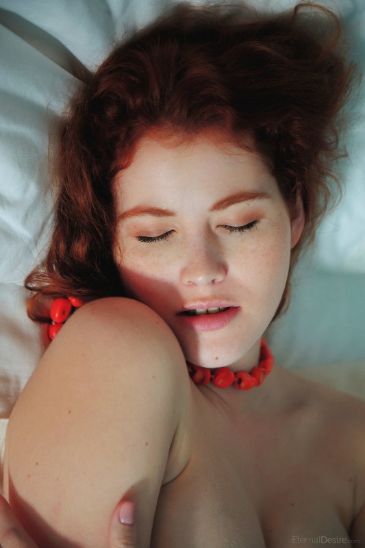 Сногсшибательная рыжая девушка позирует голая в постели, где она встаёт раком и принимает другие, не менее возбуждающие позы. Красавица обладает великолепным телом, от которого сложно оторвать взгляд. Чего только стоит её упругая попка с гладко выбритой киской. А так же у модели волшебная грудь от вида которой теряется дар речи, а в штанах становится тесно...