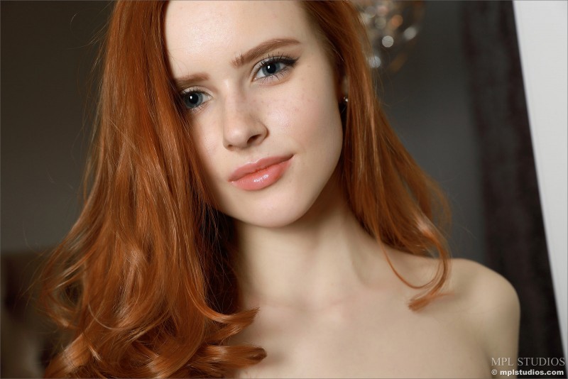 Ослепительно и ошеломительно красивая рыжая девушка с маленькими сиськами сняла чёрное нижнее бельё с рубашкой и голая стоит раком в постели, выставляя на показ упругую жопу и бритую письку. Молодая красавица принимала и другие, не менее возбуждающие позы, но прежде всего покоряет именно то фото на котором модель встала раком.