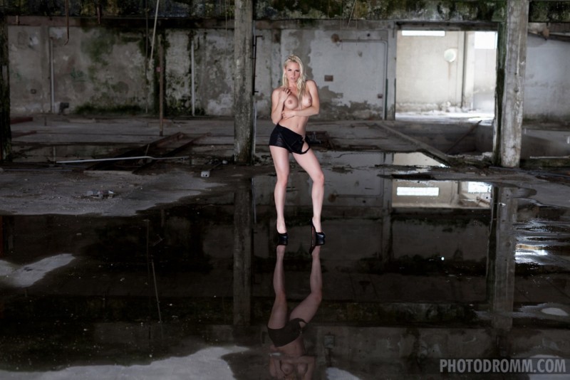 Сногсшибательная грудастая блондинка отправилась в заброшенный ангар и начала там щеголять голышом для пикантных фото. Изначально на бестии было надето откровенное короткое платье, под которым не было белья, которое она очень скоро сняла и продолжила позировать голой. Хочется отметить так же, что обольстительница имела упругую попку и ухоженную киску с интимной стрижкой.