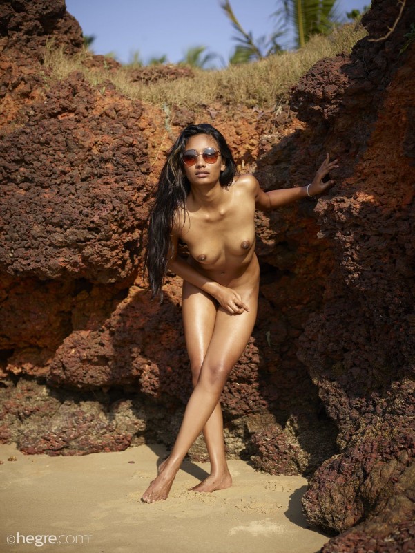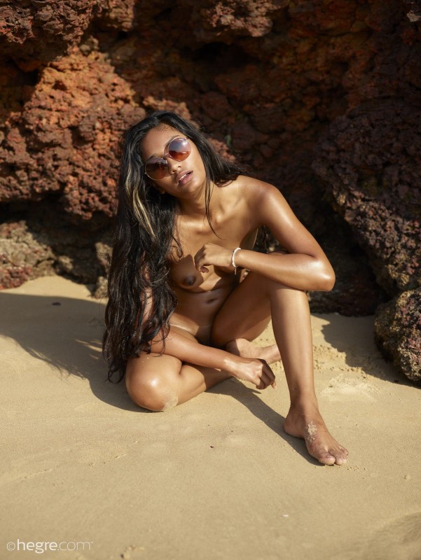 Лишившись одежды и нижнего белья, смуглая брюнетка голая позирует на пляже перед объективом фотокамеры. Стройная красавица со стройным телом позволяет нам насладиться всеми своими прелестями. Кривляясь без трусов, она демонстрирует гладко выбритую киску с коричневыми половыми губами, затем показывает упругую попку и притягательную грудь с аккуратными сосками.
