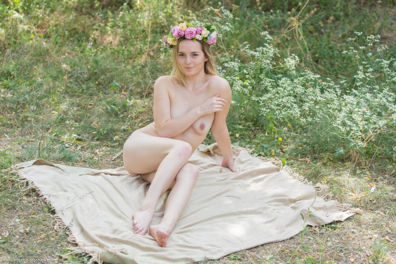 Жадная до острых ощущений блондинка отдыхает в деревне. Выбравшись подальше на природу, шалунья сняла платье под которым не было нижнего белья и совершенно голая, без всякой одежды позирует перед фотокамерой. Расположившись на покрывале, заранее расстеленном на траве, она демонстрирует небольшие сиськи, смачную попку и бритую письку.