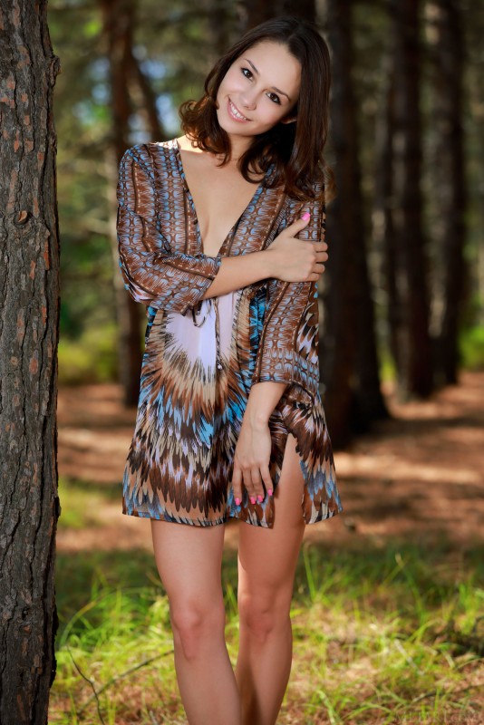 Прекрасным летним днём оказавшись в лесу под кедром, молодой девушке захотелось поразвлечься и вооружив своего товарища фотокамерой, она голая позирует в откровенных позах. Стройная красавица показывает упругую попку с притягательным анусом, хвастается маленькой грудью и красивой бритой киской.
