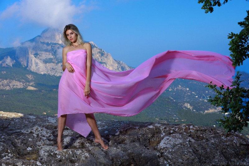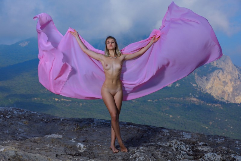 Забравшись очень высоко в горы, молодая туристка со своим другом воспользовались прекрасным пейзажем и уединённостью, что бы сделать эротическую фото сессию в стиле ню. В откровенных позах блондинка демонстрировала свою упругую попку с смачными ягодицами, хвасталась розовой киской и мяла руками сиськи.