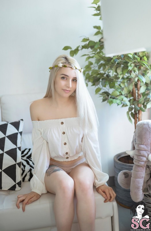 Очаровательная нежная скромница эротично позирует на диване и возбуждающе показала свою красивую упругую грудь, медленно сняв легкую блузку. Оголив свое молодое сексуальное тело, милая блондиночка развратно извивается в разных откровенных позах, выпячивая свою аппетитную попку.