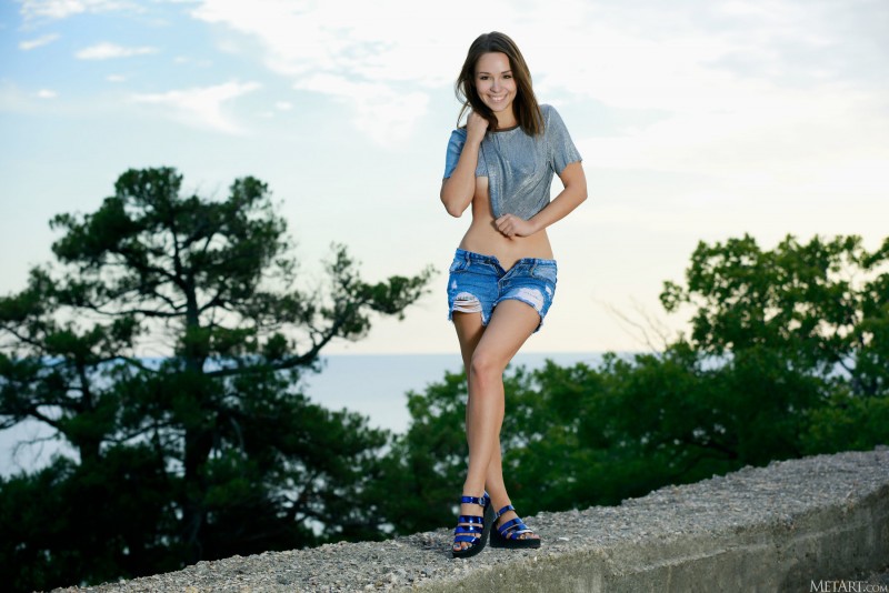 Далеко от города и посторонних людей, очаровательная молодая шалунья встает перед камерой и на показ медленно снимает свои короткие джинсовые шортики, соблазнительно оголяя свою красивую упругую попочку и с разных ракурсов засвечивая бритую сочную киску с розовыми половыми губками.