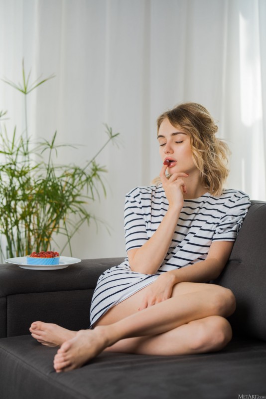 Задрав перед камерой свободную футболку, нежная миниатюрная барышня без трусиков бесстыже раздвинула свои стройные красивые ножки и выставила на показ крупным планом бритую нежную киску. Затем, раздевшись до гола, стройная девушка с упругой грудью чувственно извивается всем телом на большом диване, с разных ракурсов демонстрируя нам свои самые интимные сладкие местечки.