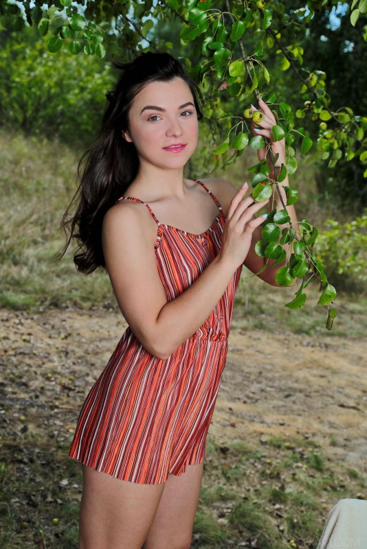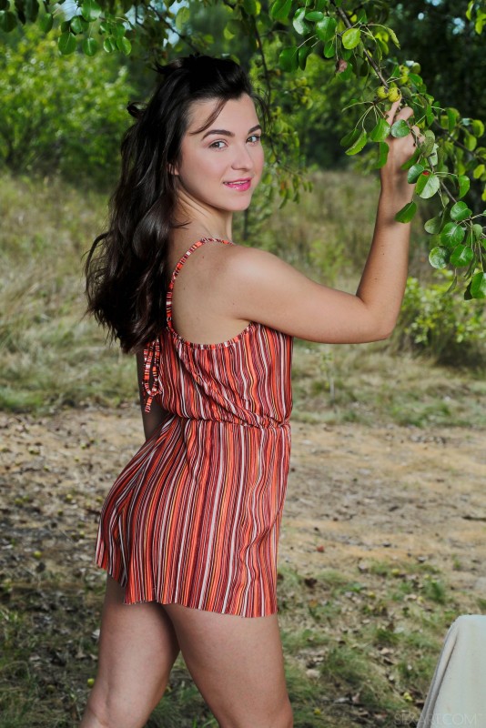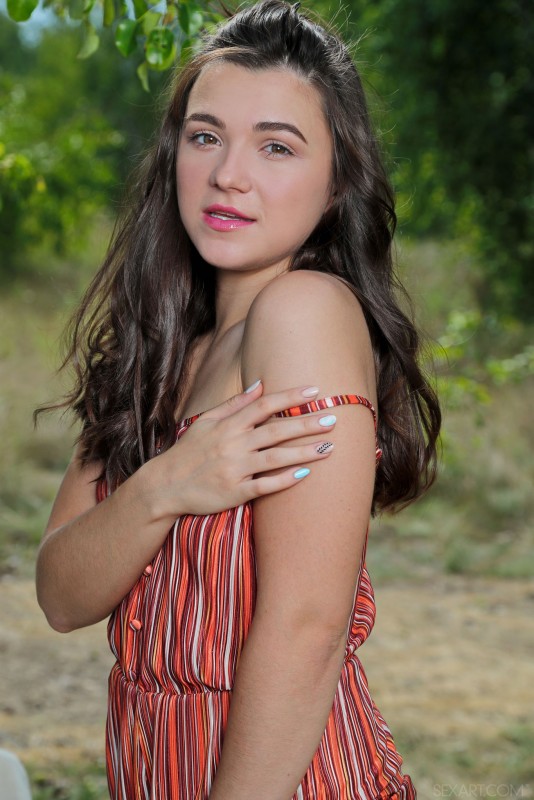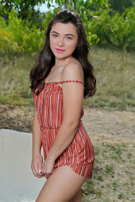 Кокетливо стянув с себя короткий летний комбинезон, аппетитная голая брюнетка с упругими сиськами и сочной задницей устроилась на специально принесенном стуле и широко раздвинула ноги на природе, выставляя на показ свою бритую промежность и нежно поглаживая влажную розовую письку.