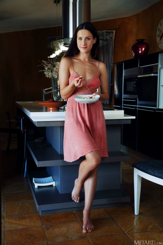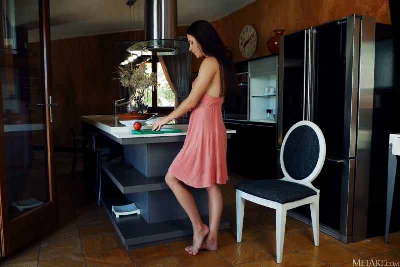 Наконец-то закончив со всеми делами на кухне и решив немного пошалить, развратная жена кокетливо сняла с себя домашнее платье и, оказавшись перед нами абсолютно обнаженной, охотно показала свой сочный мясистый вареник на камеру. Забравшись голышом на стол, горячая штучка с упругими сиськами бесстыже раздвигает свои стройные ножки и крупным планом выпячивает вперед бритую промежность с большими темными половыми губищами.
