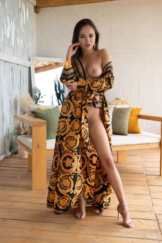 Экзотическая эротическая модель резко распахнула перед камерой свой шелковый халат и во всей красе показала нам свои голые аппетитные прелести. Вовсю светя упругими сиськами, горячая красотка соблазнительно прогибается в спинке и, крупным планом выпятив крепкую подтянутую попку, хвастается своей бритой киской с большими темными губками между ног.