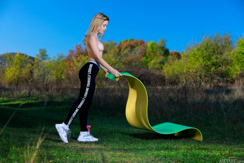Выполняя перед камерой упражнения и постепенно снимая с себя обтягивающую одежду, молодая спортивная детка без стеснения оголила свои упругие титьки и попу, а затем, лежа обнаженной на коврике с широко раздвинутыми ногами, хвастается на камеру бритой розовой пиздёнкой с разных ракурсов.