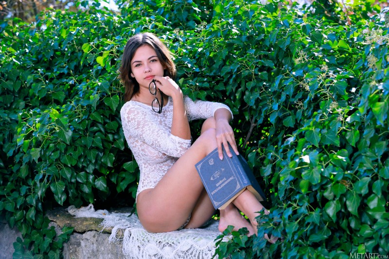 Игриво спрятавшись ото всех в пышных зеленых кустах, аппетитная девушка в кружевном боди возбуждающе медленно оголила выдающиеся прелести и сразу же принялась развратно сжимать их своими шаловливыми ручонками. Похваставшись большими буферами и мягкой попочкой, секси детка не останавливается на этом и кокетливо засвечивает между ног гладкую пухлую писечку.