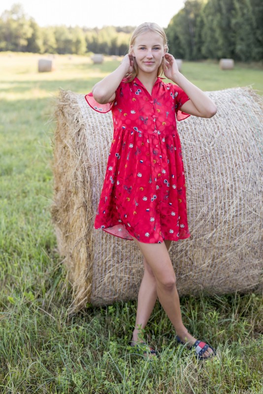 Медленно расстегнув и сняв с себя простенькое короткое платье, голая деревенская девка с натуральными сиськами и нежной мягкой попкой бесстыже раскрыла свою рогатку прямо на сеновале и, с нетерпением поджидая на сем своего ухажёра, представляет его длинный твердый член глубоко в своей киске.
