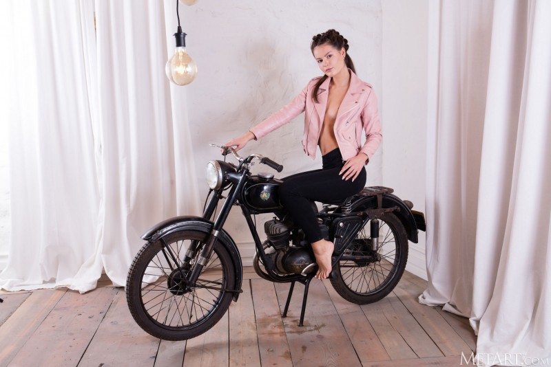 Медленно стянув со стройных ножек обтягивающие штаны и устроившись на кожаном сиденье с широко раздвинутыми ногами, дерзкая штучка с маленькими сиськами и крепкой подтянутой задницей развратно светит своей бритой киской на мотоцикле и даже выпячивает ее на камеру крупным планом.