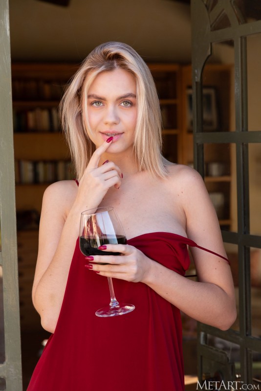 Залив в себя приличное количество вина, бухая потаскуха эротично сняла с себя красное платье и во всей красе показала свои голые сиськи и задницу. Чувственно извиваясь всем телом и возбуждающе трогая себя в разных местах, сексуальная блондинка приглашающе раскрывает перед камерой стройные ножки и приглашает нас полюбоваться своей бритой красивой киской с интимной стрижкой на лобке.