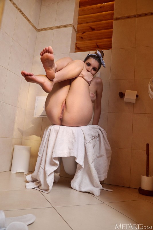 Голая сучка демонстрирует розовую письку в туалете