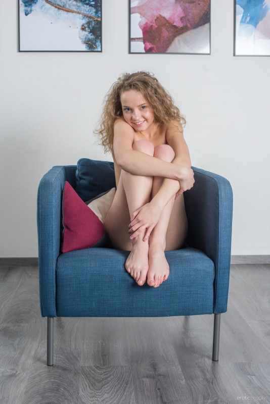 Вовсю кокетничая с нами через камерой и резво стянув со своего стройного тела кружевное белье, кудрявая шалунья с миниатюрными нежными титечками энергично кувыркается в кресле с разных позах и возбуждающе засветила в голой промежности свою бритую нежную писю.