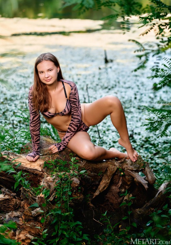 Быстро сняв с себя купальник и игриво поплескавшись в речке, голая мокрая красотка с упругой попой и сиськами без стеснения загорает на берегу перед снимающей ее камерой и, чувственно лаская руками свое горячее тело, возбуждающе раскрывает между ног пухлую бритую киску.