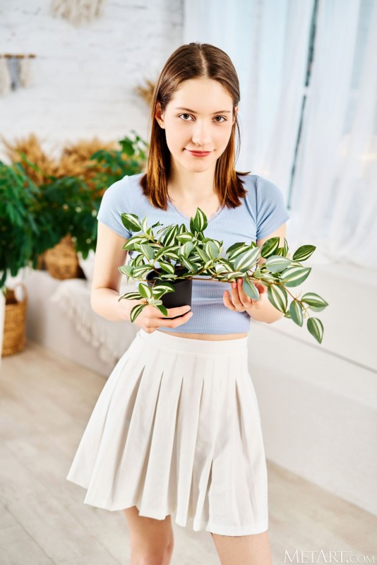 Крутясь перед камерой в разных позах и засвечивая под мини юбкой свои белые трусики, молодая простушка постепенно оголила для нас своим маленькие скромные сиськи и, лежа в кровати с выставленными на показ прелестями, приглашающе раскрывает между стройными ножками свою пухлую розовую пиздёнку.