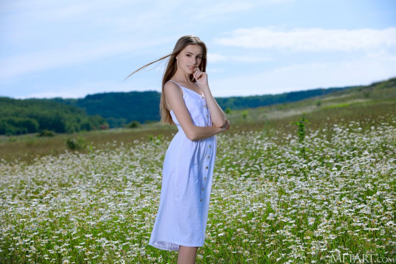 Возбуждающе медленно сняв с себя летнее платье без нижнего белья и встав перед камерой абсолютно обнаженной, красивая стройная девушка с маленькими титечками и попкой разлеглась в поле с цветами с широко раздвинутыми ногами и крупным планом показала свою бритую губастую письку на природе.