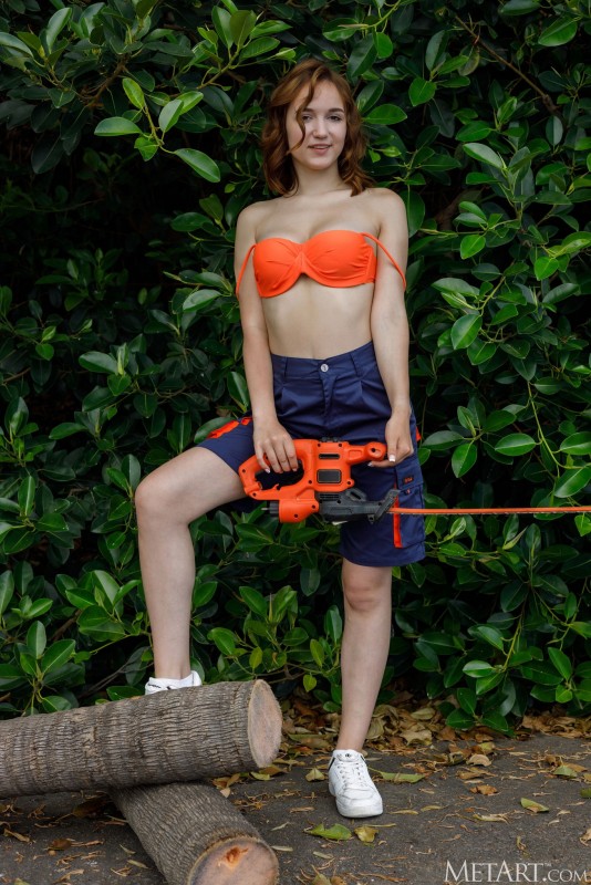 Хорошенько намахавшись бензопилой и для удобства даже избавившись от сжимающего ее лифчика, горячая сочная деваха с голыми упругими сиськами с удовольствием снимает с себя перед камерой шорты, а потом развратно позирует голой перед камерой, с разных ракурсов раскрывая в промежности бритую маленькую письку крупным планом.