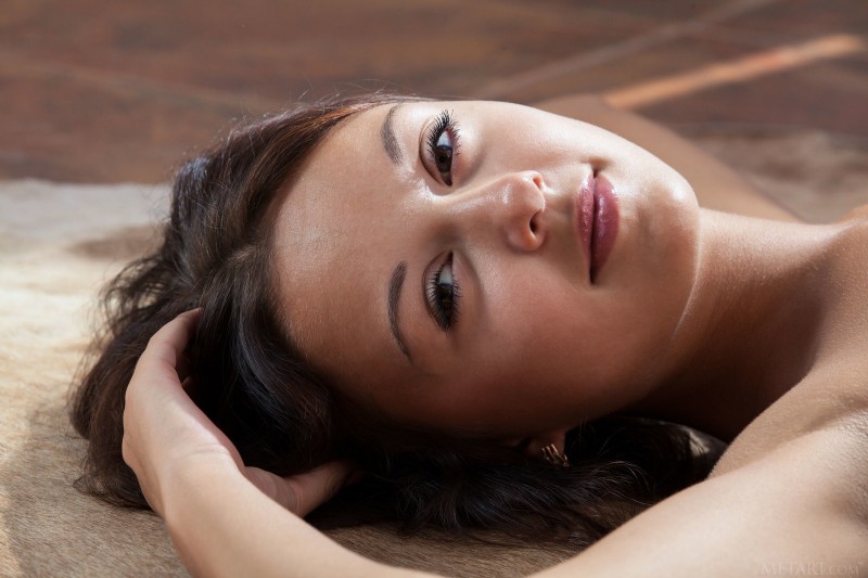 Худенькая, но довольно привлекательная голая девушка с отчётливыми следами от купальника позирует на шкуре убитого зверя, которая аккуратно расстелена на полу. Принимая разнообразные позы брюнетка демонстрирует нам маленькие сиськи, бритую киску и симпатичную попку с милыми и упругими ягодицами.