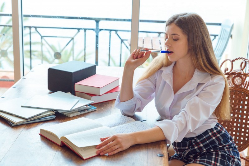 Закончив заниматься и решив сделать небольшой перерыв, аппетитная студентка в мини юбке и блузке возбуждающе медленно оголила свои сочные буфера и другие прелести. Затем голая девка забралась голышом на стол и, выставив на показ свою раскрытую бритую промежность, тут же принялась нежно играться пальчиками с розовой писькой.