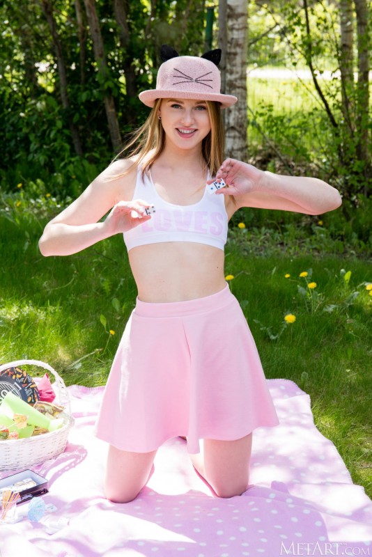 Веселясь и вытворяя разные неприличные вещи на природе, молодая симпотяжка в короткой юбке и майке игриво оголила под всей своей одеждой сочную мягкую попу и, виляя ею перед камерой в разных позах, также показывает нам бритую промежность с маленькой розовой писей.