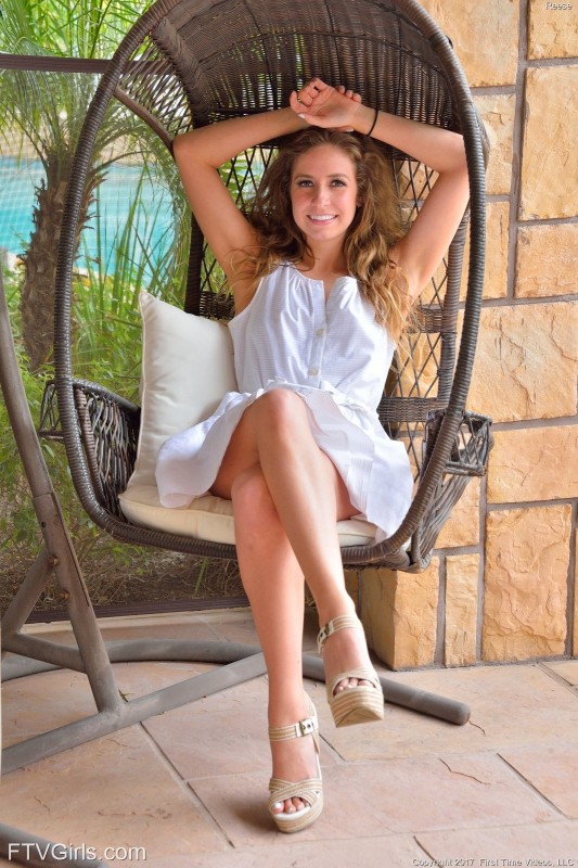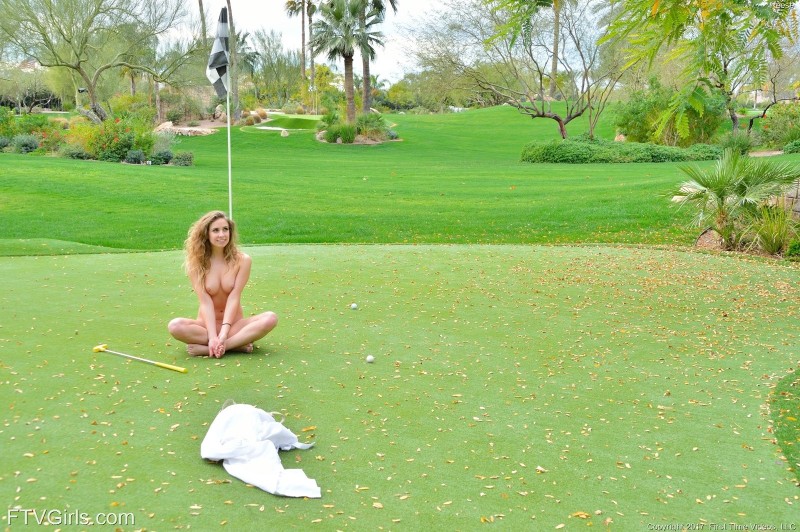 Соблазнительная озорница в коротком белом платье без трусов позирует на поле для гольфа. Там красавица задирает юбку и показывает голую попку и бритую письку. Вскоре девушка полностью раздевается и совершенно голая продолжает хвастаться своим стройным телом и самыми интимными частями тела, включая маленькую грудь.