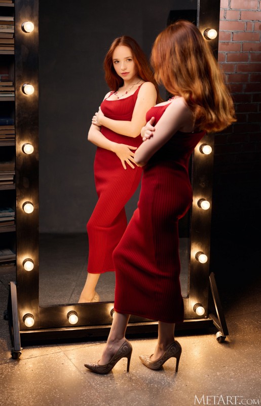 Так и сяк любуясь своим сексуальным телом в отражении и медленно стягивая с себя обтягивающее красное платье с трусиками, фигуристая рыжая детка с большими буферами свободно позирует голышом перед зеркалом и мельком засвечивает между аппетитными бёдрами свою бритую письку.