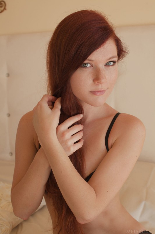 Очаровательная рыжая девушка в нижнем белье чёрного цвета обнажается перед нами в своей спальне. Сперва красавица стягивает с себя лифчик, а затем и соблазнительные трусики. Оказываясь совершенно голой, девушка забирается в постели и там принимая самые возбуждающие позы, она позволяет разглядеть её киску и сочную попку.